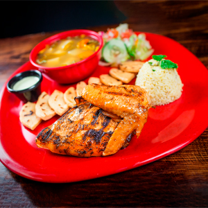 | 1/4 gallina asada, acompañada de arroz, tortilla, aderezo y ensalada fresca. | |