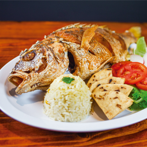 Pescado frito con 2 camarones grandes Crujiente pescado frito acompañado de 2 camarones grandes al ajillo, arroz, tortilla frita, ensalada fresca y aderezo. |