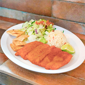Filete de pescado empanizado Crujiente filete de pescado, acompañado de arroz, tortilla frita, ensalada fresca y aderezo. |