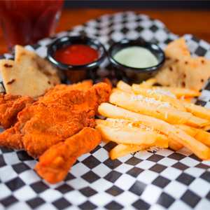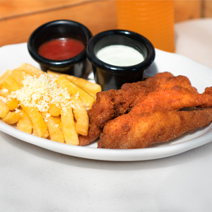 Deditos de pollo - 4 oz Crujientes tiras de pollo empanizado acompañado de aderezo y papitas fritas con salsa ketchup y tortilla frita. (Incluye bebida) |