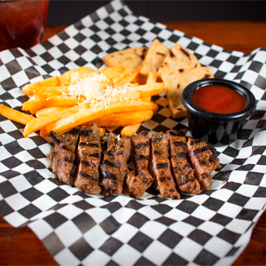 Carne Infantil - 4 oz Fajitas de carne asada acompañadas de papitas fritas con salsa ketchup, aderezo y tortilla frita. (Incluye bebida) |