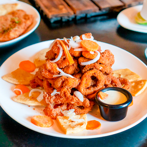 Deliciosa combinación de camarones, calamares y trocitos de filete de pescado acompañado de cebollita curtida, aderezo y tortilla frita |