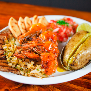 | Delicioso lomito rollizo asado, acompañado de cuatro camarones grandes sazonados al ajillo, papa al horno o arroz, tortilla frita y chirimol. | |
