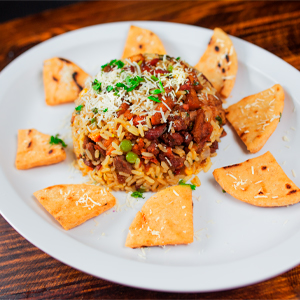 | ¿Lo tuyo no son los mariscos? Puedes optar por una deliciosa mezcla de arroz con trocitos de costilla, chorizo, carne, chicharrones y tortilla frita. | |